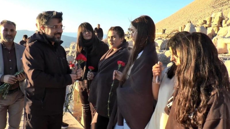 Kültür ve Turizm Müdürü Abuzer Gelse ve yetkililer, turistlere karanfil vererek Nemrut Dağı ile ilgili bilgi verdi.
