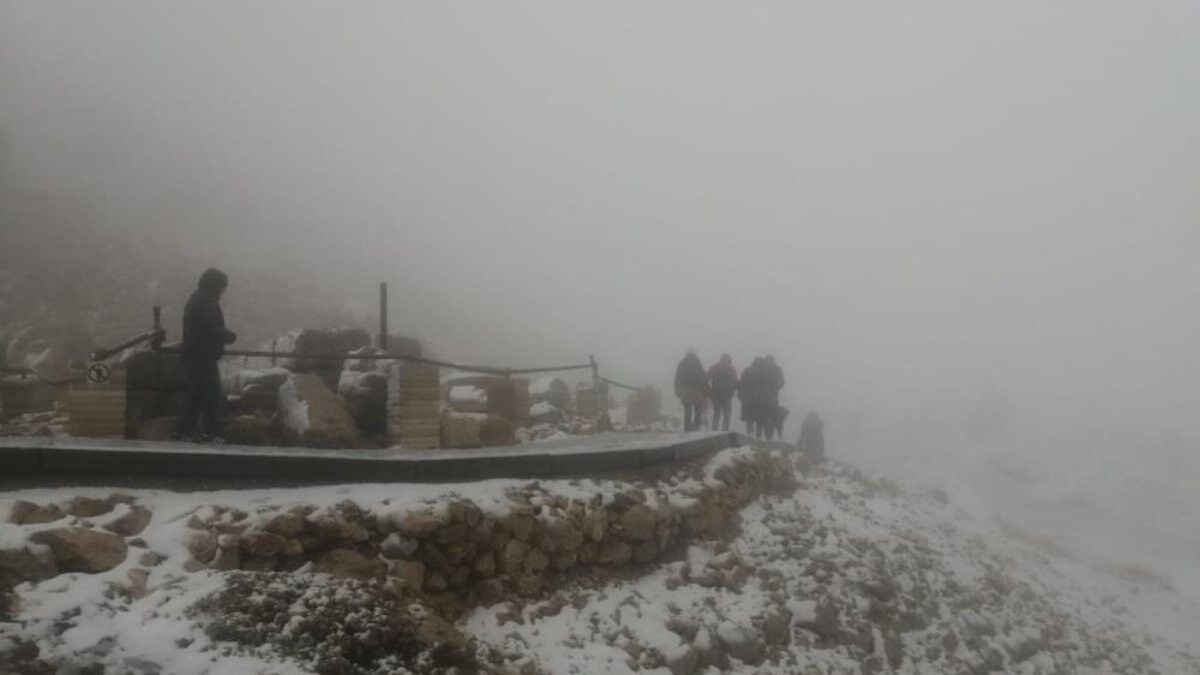 2 bin 206 metre yükseklikteki Nemrut Dağı zirvesine çıkan turistler, bir anda bastıran kar yağışı karşısında büyük heyecan yaşadı.