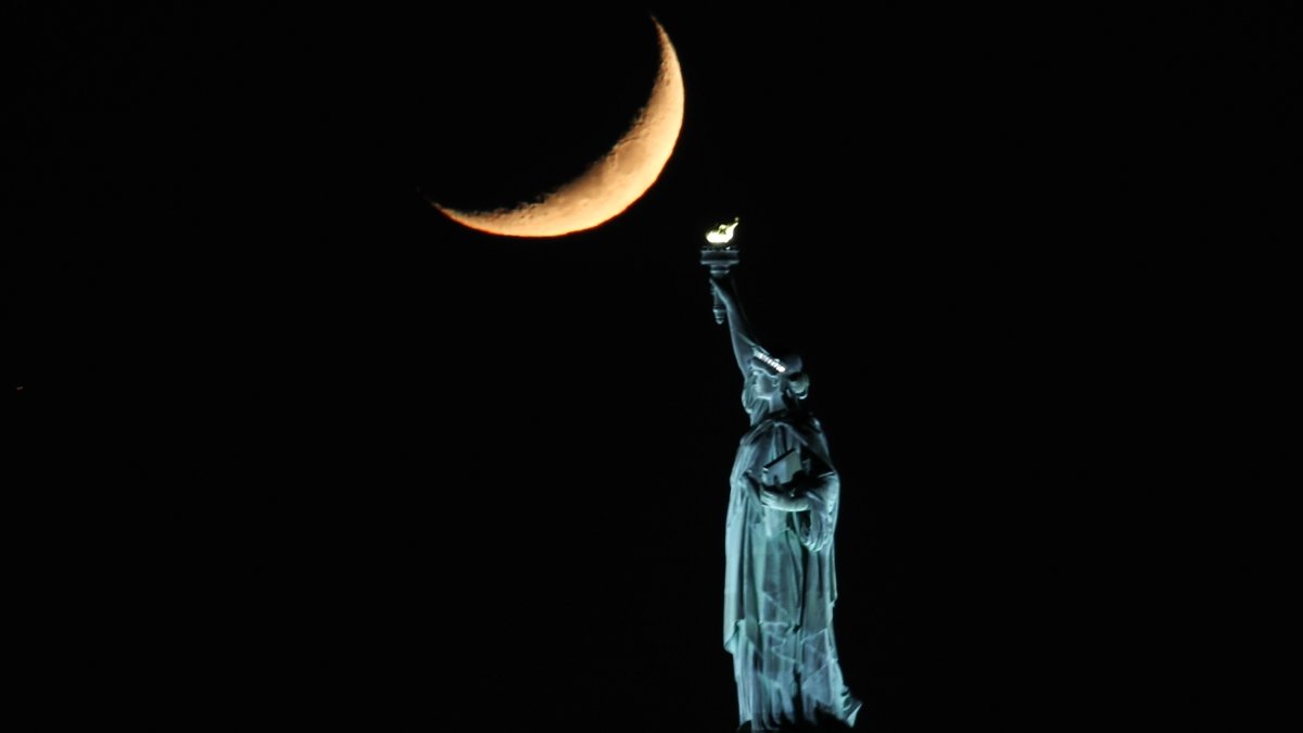 Akşam saatlerinde beliren hilal, zamanla Özgürlük Heykeli’ne doğru yanaştı. Bu sırada da kadraja çok özel anlar yansıdı.