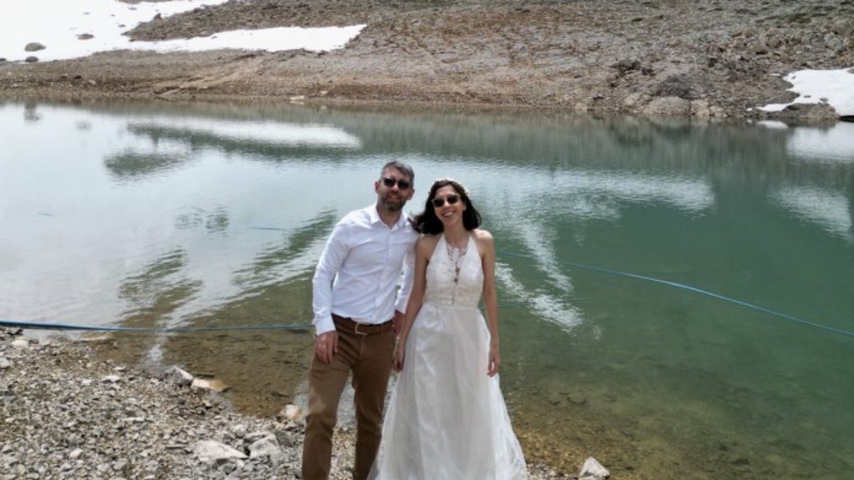 Gelinlik ve damatlığı askıyla sırt çantalarında taşıyan ve yolda buldukları çiçeklerle gelin tacı yapan dağcı çift, göllere ulaşmak için 14 kilometre tırmanış gerçekleştirdi.