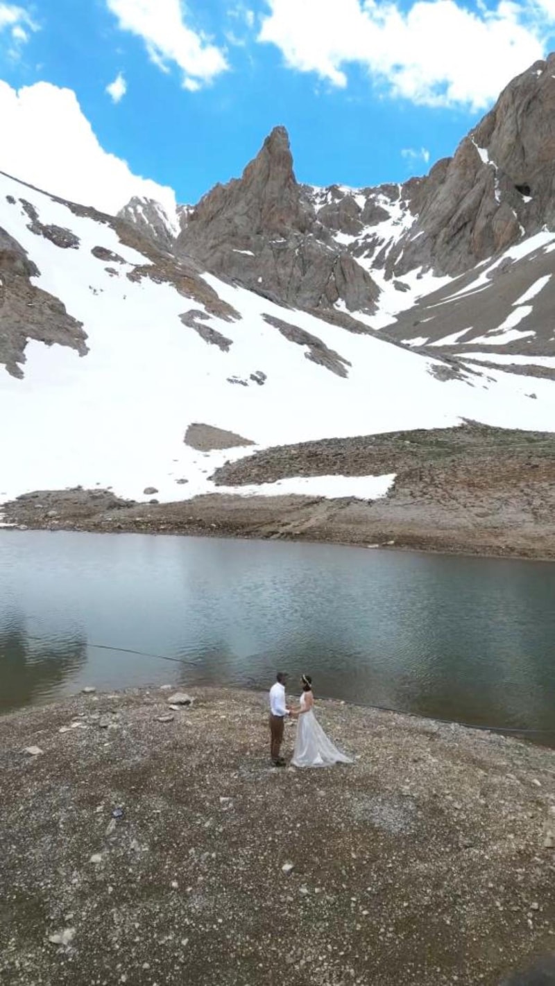 Aladağlar’daki 2 bin 840 metre yükseklikteki Kara Göl ve 2 bin 910 metre yükseklikteki Çömçe Göl'de kendilerini çeken çift, "Sürekli dağlarda olan bir çift olarak özel ve bizi yansıtan bir an olması için dış çekimimizi dağda yapmaya karar verdik." dedi.