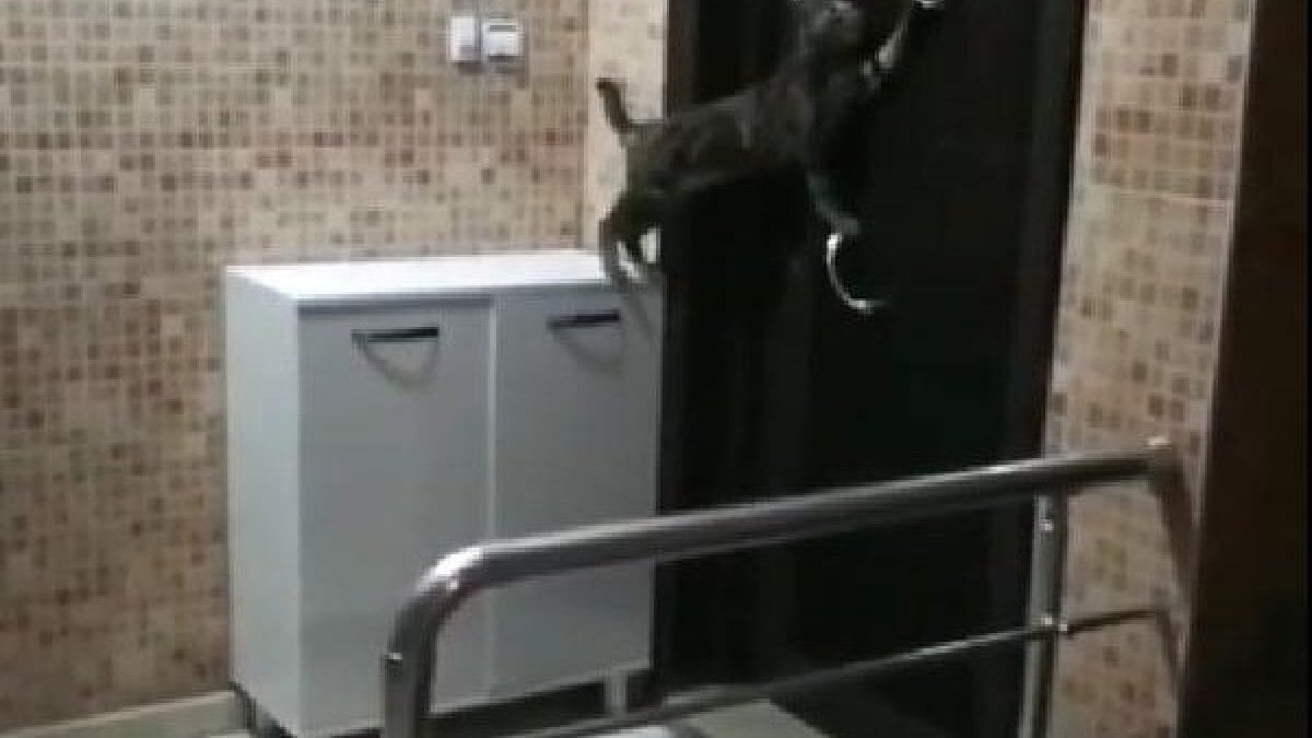 Tokmakla vurduğu kapı açılmayan kedi, bu işlemi birkaç kez tekrarladı. Kedinin bu anlarının yer aldığı görüntüler sosyal medya üzerinden paylaşıldı.