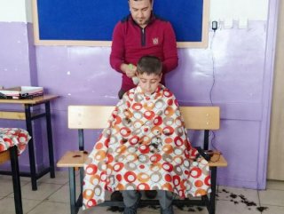Şehit Danış Tunalıgil İlkokulu'nda görev yapan sınıf öğretmeni Deniz, erkek öğrencilerini sınıfta makineyle tıraş ediyor.