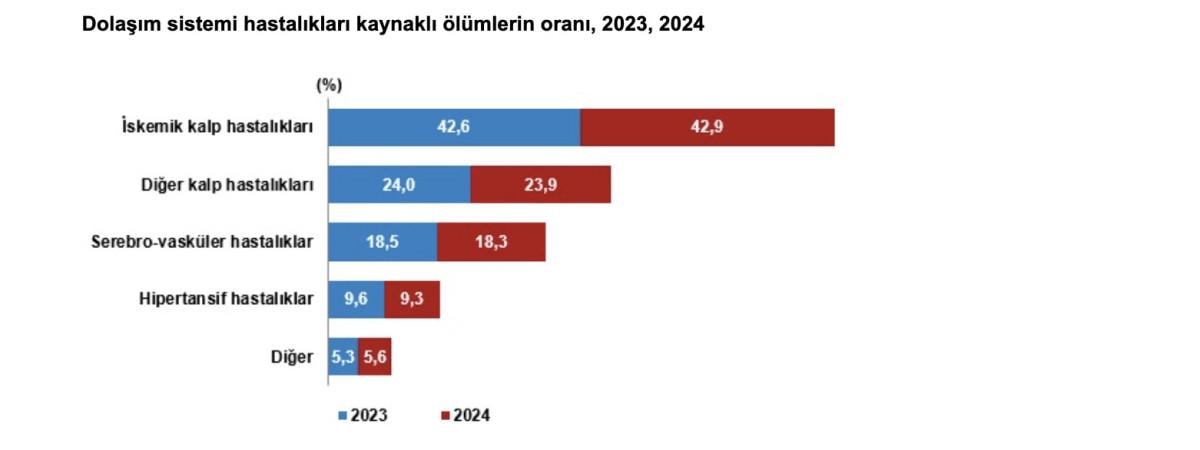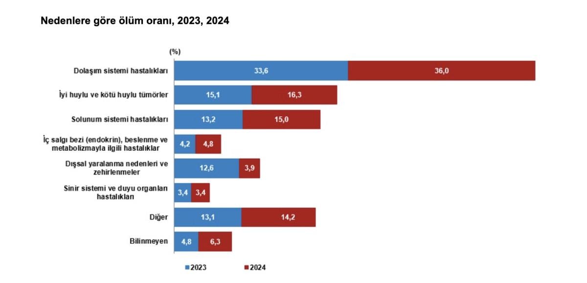 Ölümler nedenlerine göre incelendiğinde, 2024 yılında yüzde 36 ile dolaşım sistemi hastalıkları ilk sırada yer aldı.