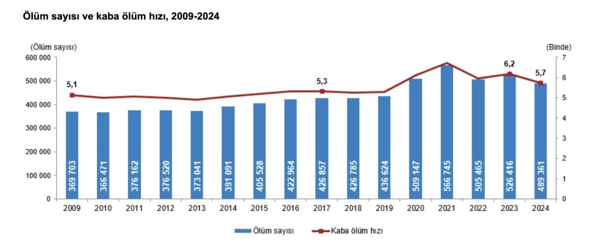 Ölüm sayısı 2023 yılında 526 bin 416 iken 2024 yılında 489 bin 361 oldu.