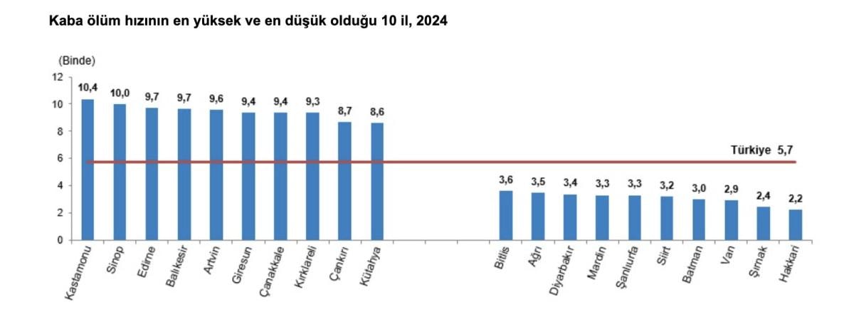 Kaba ölüm hızının en yüksek olduğu il, 2024 yılında binde 10,4 ile Kastamonu oldu. Bu ili binde 10,0 ile Sinop, binde 9,7 ile Edirne ve Balıkesir, binde 9,6 ile Artvin izledi.
