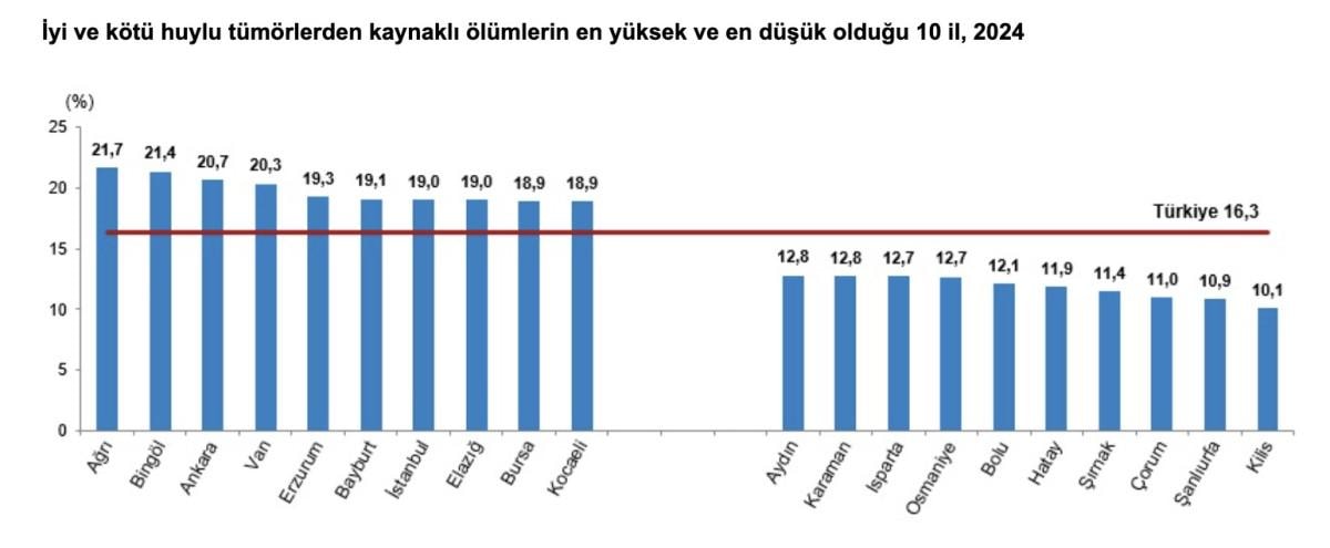 İyi ve kötü huylu tümörlerden kaynaklı ölümler illere göre incelendiğinde, 2024 yılında bu hastalıklara bağlı ölüm oranının en yüksek olduğu ilin yüzde 21,7 ile Ağrı olduğu görüldü. Bu ili yüzde 21,4 ile Bingöl, yüzde 20,7 ile Ankara, yüzde 20,3 ile Van izledi. Bu hastalıklara bağlı ölüm oranının en düşük olduğu ilin ise yüzde 10,1 ile Kilis olduğu görüldü. Bu ili yüzde 10,9 ile Şanlıurfa, yüzde 11 ile Çorum, yüzde 11,4 ile Şırnak izledi.