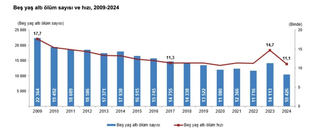 Doğumdan sonraki beş yıl içinde ölme olasılığını ifade eden beş yaş altı ölüm hızı, 2023 yılında 14,7 iken 2024 yılında binde 11,1 oldu.