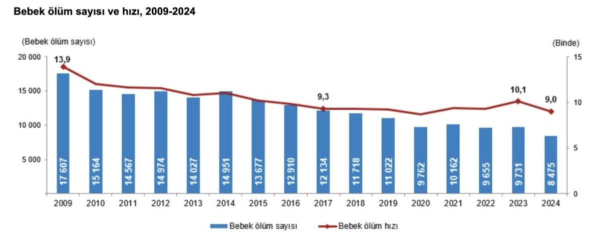 Bebek ölüm sayısı, 2023 yılında 9 bin 731 iken 2024 yılında 8 bin 475 oldu. Bin canlı doğum başına düşen bebek ölüm sayısını ifade eden bebek ölüm hızı, 2023 yılında binde 10,1 iken 2024 yılında binde 9 oldu.