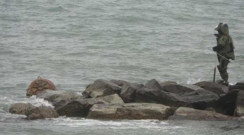 Sahilden yaklaşık 30 metre açıkta bulunan ve mayına benzediği görülen cisim, dalgaların şiddetiyle kıyıya yaklaşarak kayalıklara takıldı. Bomba imha uzmanı, cismin yanına giderek inceleme yaptı.