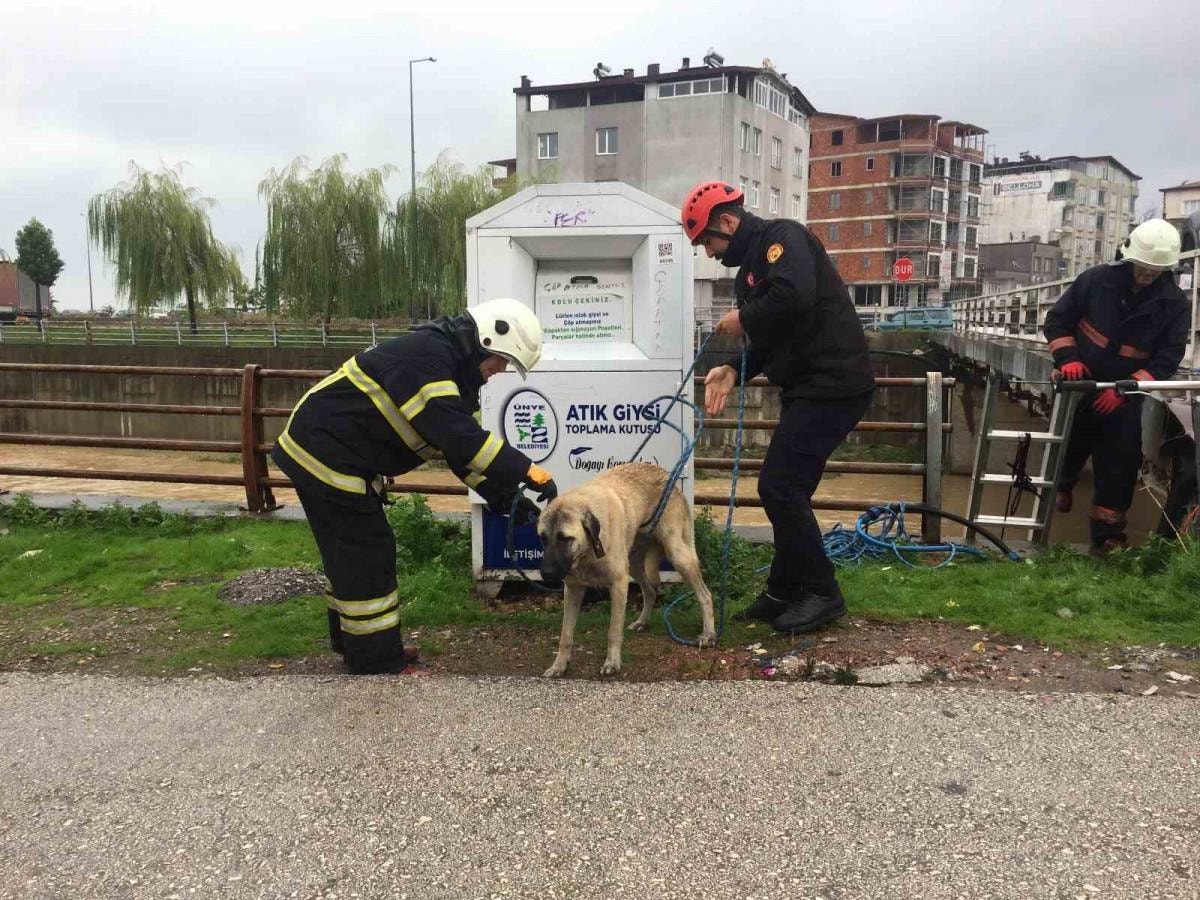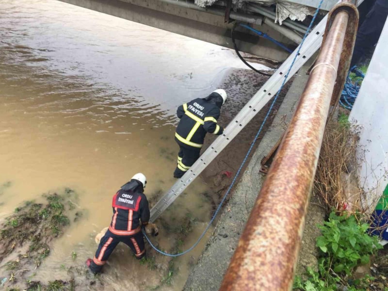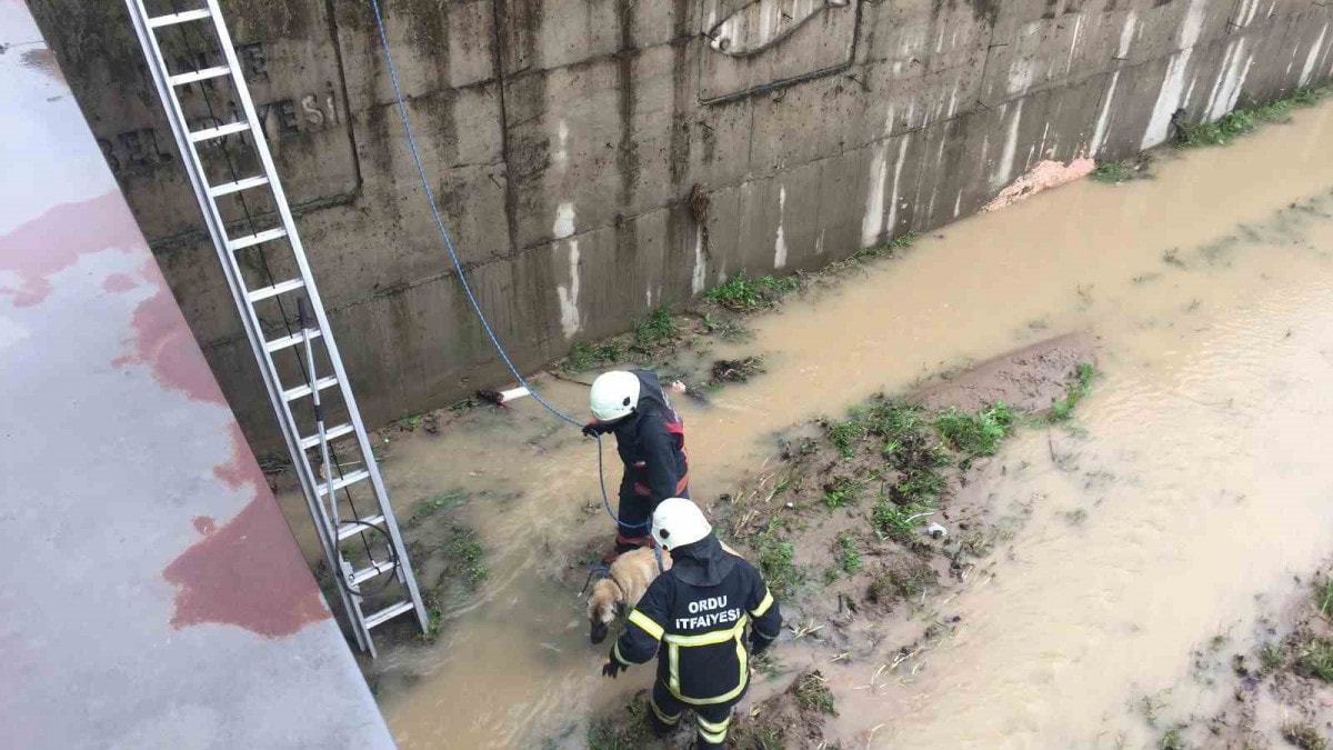 Olay yerine gelen Ordu Büyükşehir Belediyesi Ünye İtfaiye Grup Amirliği ekipleri dere yatağına girerek merdiven yardımıyla ile köpeğin yanına kadar gitti.