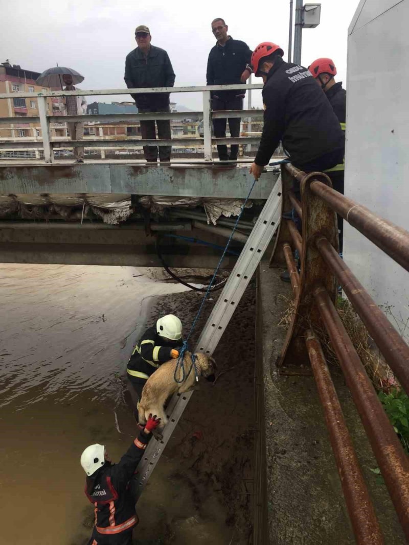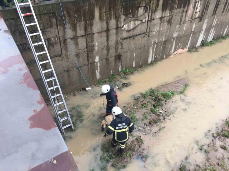 Ünye ilçesinde dereye düşen köpeğin sesini duyanlar ihbarda bulundu. Ekipleri merdivenle indiği deredeki köpeği çıkardı.
