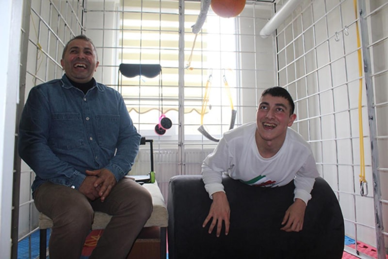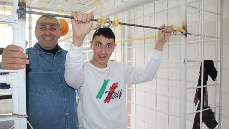 Ünye ilçesinde yaşayan bedensel engelli Doğan Kurt, babasının fizyoterapi merkezlerinden esinlenerek evin bir bölümüne kurduğu alanda yaptığı çalışmalar sayesinde adım atmaya başladı.