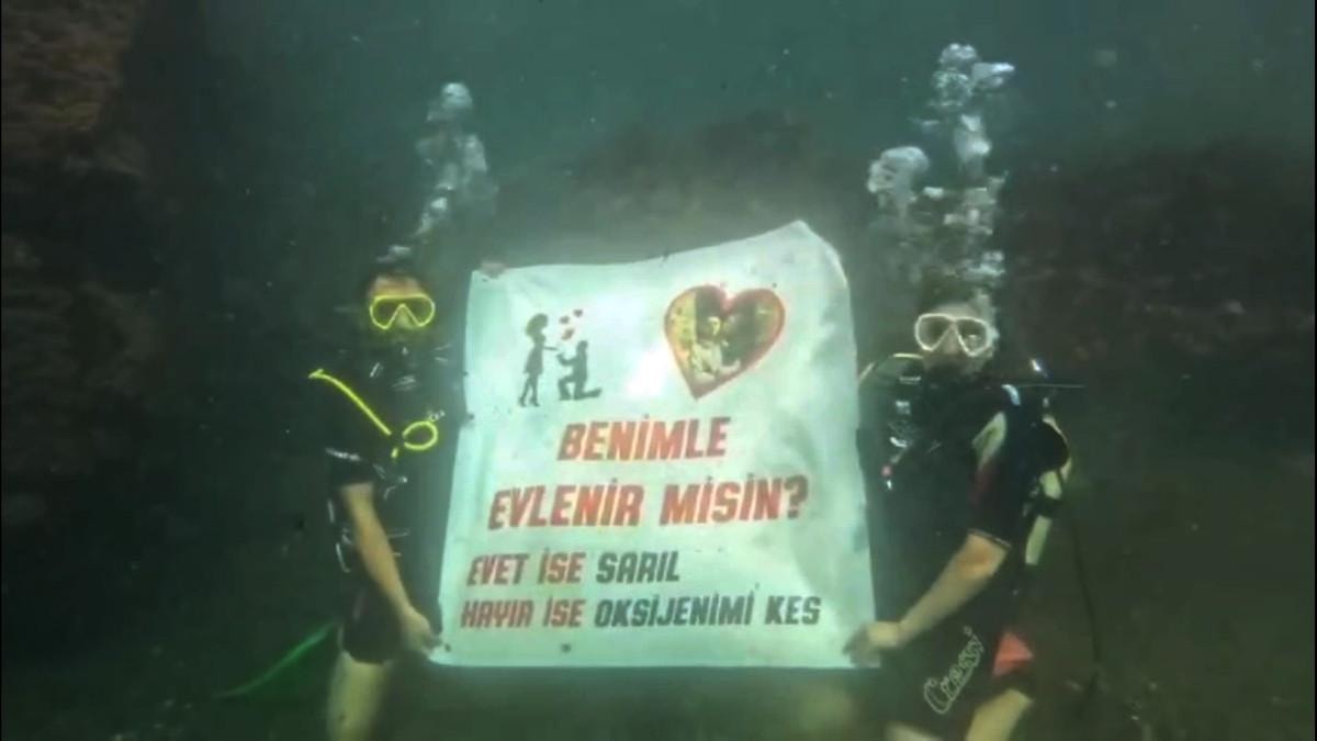 Su altında Damlanur Sarı'ya evlilik teklifi yapan Sefa Türel, pankarta 'Benimle evlenir misin? Evet ise sarıl, hayır ise oksijenimi kes' yazdırdı.