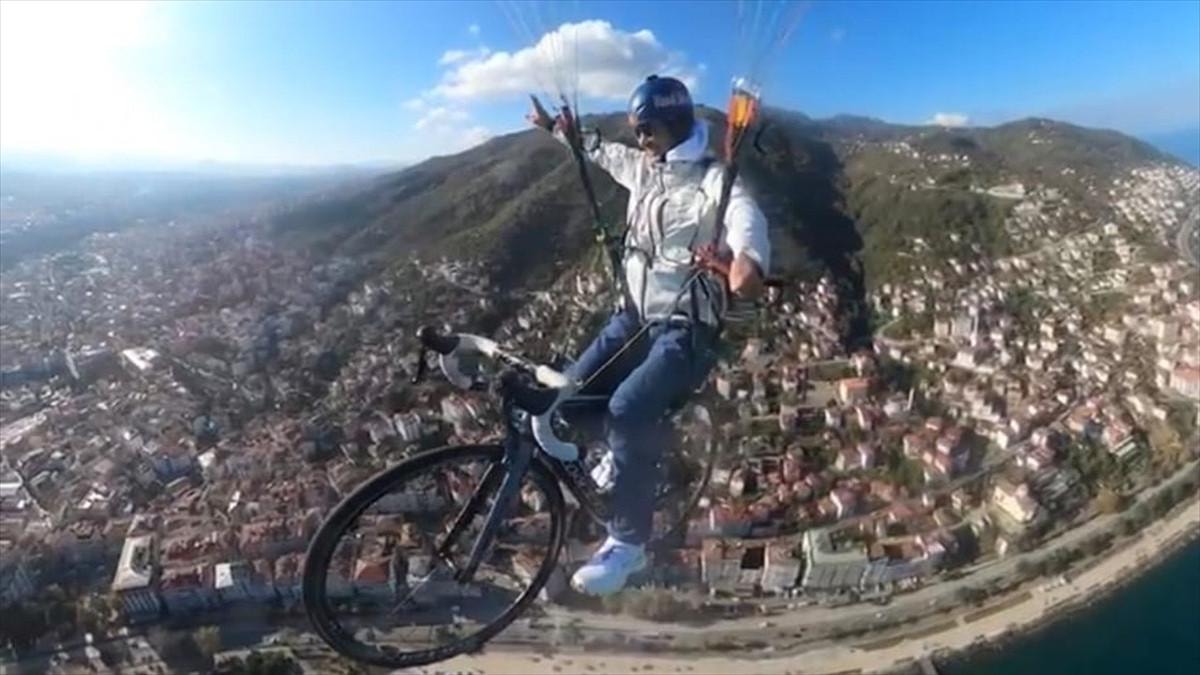 Boztepe'ye çıktıktan sonra bisikleti kendine bağlayarak yamaç paraşütüyle havalandı. Gökyüzünde pedal çevirmenin heyecanını yaşayan Şahin, her iki tutkusunu aynı anda gerçekleştirmenin keyfini yaşadı.