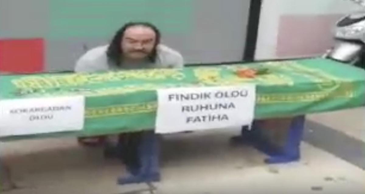 Temsili bir tabutun başında duran Güngör, tabutun üzerine 'Fındık öldü ruhuna Fatiha' yazısı astı.