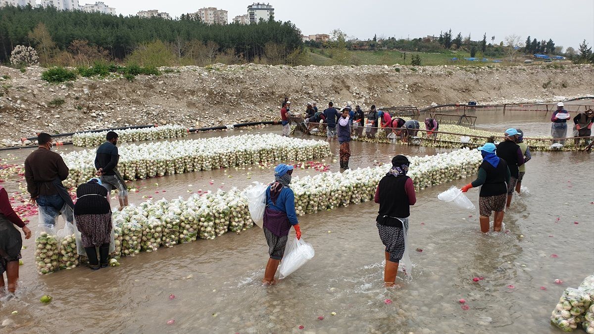 Osmaniye'nin Kadirli ilçesinde ismini açıklamayan hayırsever, Savrun Çayı'nda turp yıkayarak paketleyen işçilere 100'er lira dağıttı.