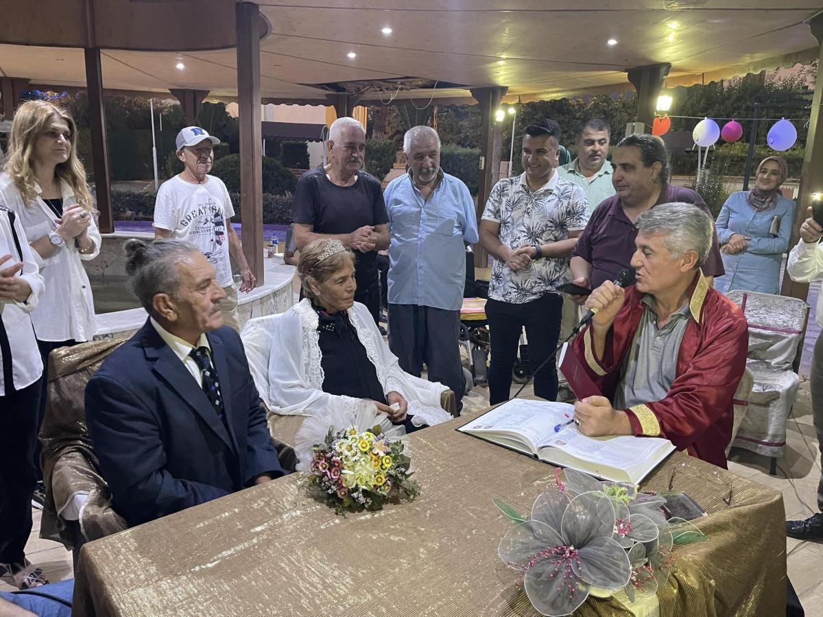 Huzurevi bahçesinde düzenlenen törenle ikinci bahara evet diyen çift, alkışlar eşliğinde nikah defterini imzaladı.