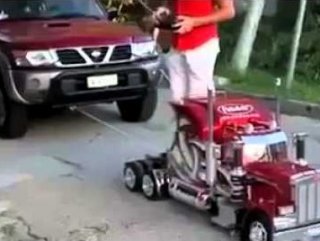 Oyuncak TIR'ın kendinden tonlarca ağır olan jipi çektiği görüntüler hayrete düşürüyor. Binlerce kullanıcı tarafından izlenen görüntülerde oyuncak TIR zorlanmadan gerçek bir jipi çekerek götürüyor.