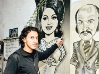 Oturduğumuz sokağın bir duvarındaki bu oyuncu karikatürlerinin önünde poz vermek hoşuna gidiyor Enver'in. Bu buluşmadan sonra Cihangir'e gidecek. "Yeni Yeşilçam orası" diyor. Haklı belki de.