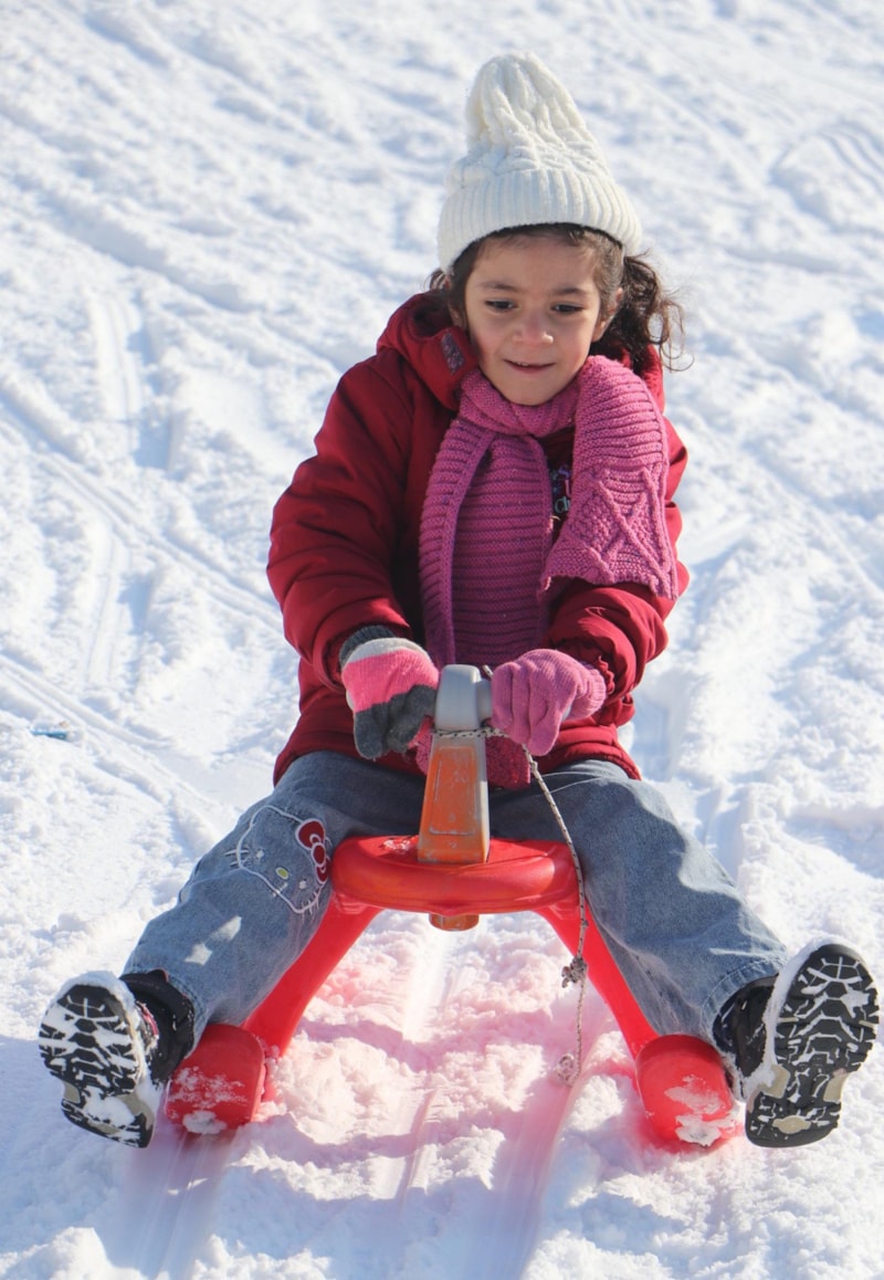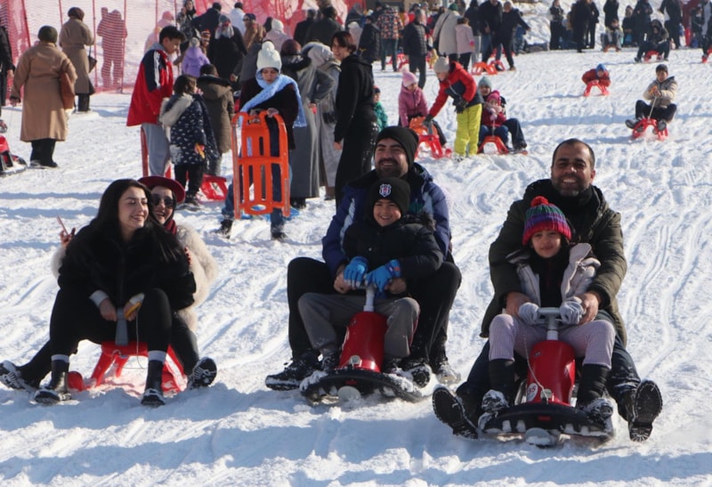 Karnelerini aldıktan sonra aileleriyle birlikte tatil için denizden 3 bin 176 metre yükseklikteki Palandöken Kayak Merkezi'ne gelen çocukların bazıları kayak öğrenirken, bazıları da kızaklarla pistte kaymanın keyfini yaşıyor.