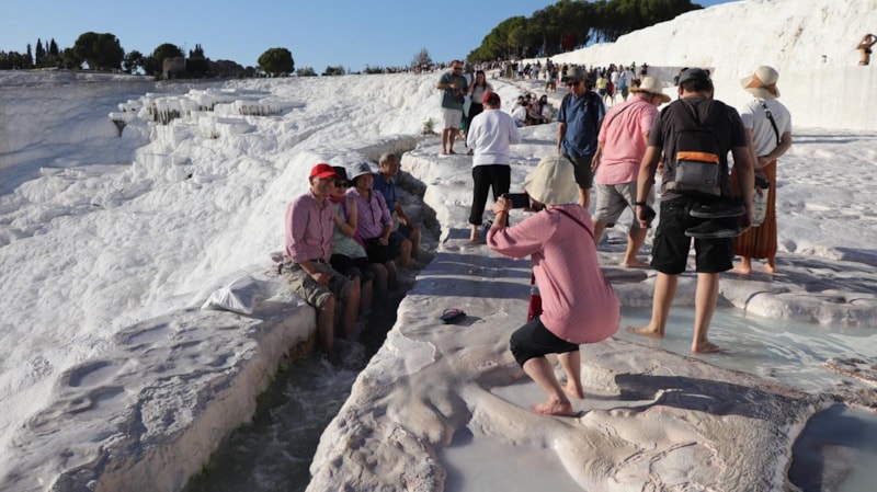 Yerli ve yabancı turistler, kendilerini adeta travertenlere attı.