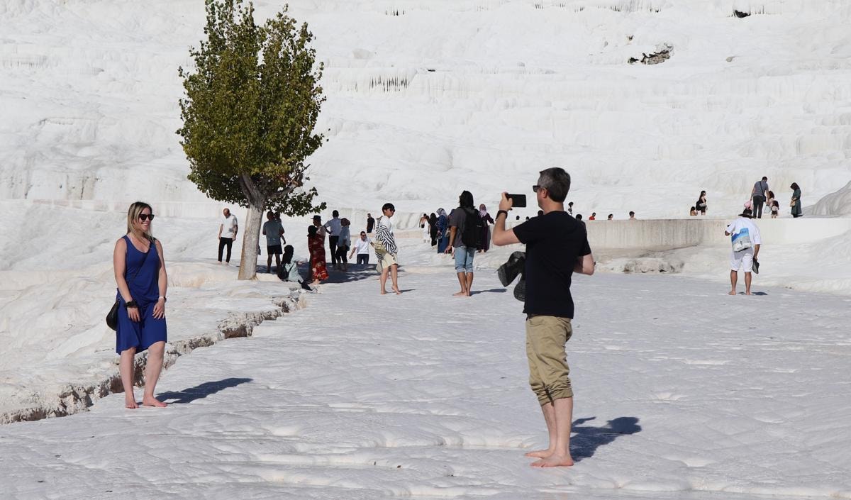 Güzelliği ile görenleri cezbeden bembeyaz travertenlerin üzerinde, Hierapolis Antik Kenti’nin tadını çıkaranlar, doğaya hayran kaldı.