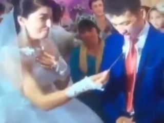 Görüntüler Kazakistan’daki bir düğün töreninden. Adet olduğu üzere gelin ve damat birbirlerine pasta yediriyor.