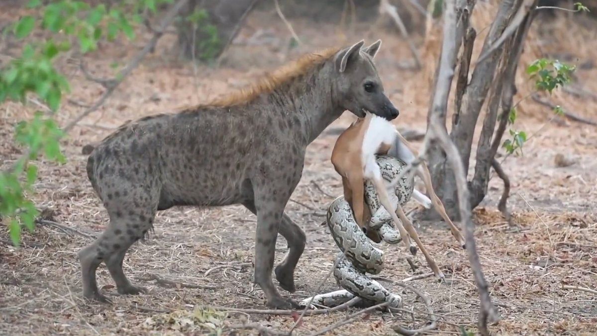 Pitonun impalayı bırakmasıyla harekete geçen dev sırtlan, amacına ulaşarak yavru impalayı kendisine yem yaptı.