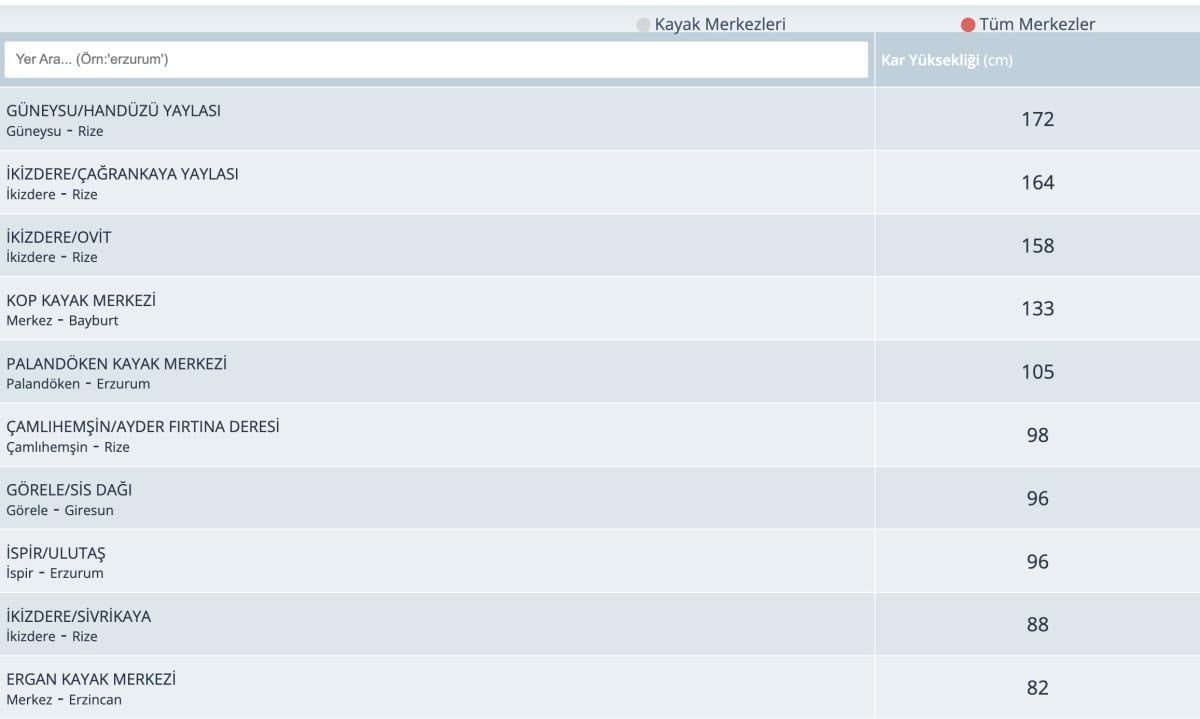 Erzurum'a bağlı Palandöken Kayak Merkezi ise 105 santimetrelik kar kalınlığı ile 4. sırada yer aldı. 5. sırada ise 100 santimetre ile Rize'nin Çamlıhemşin ilçesine bağlı Ayder Yaylası geldi.