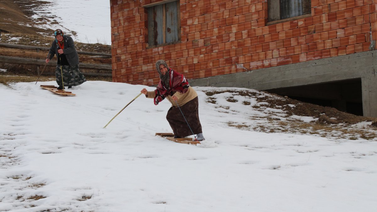 Kar toplamaması için uçları dikleştirilen tahtalara binen köylüler dengede kalabilmek için bir elinde çubuk, diğer elinde önünü kaldırarak fren yapmayı sağlayan ipe tutarak kayıyor.