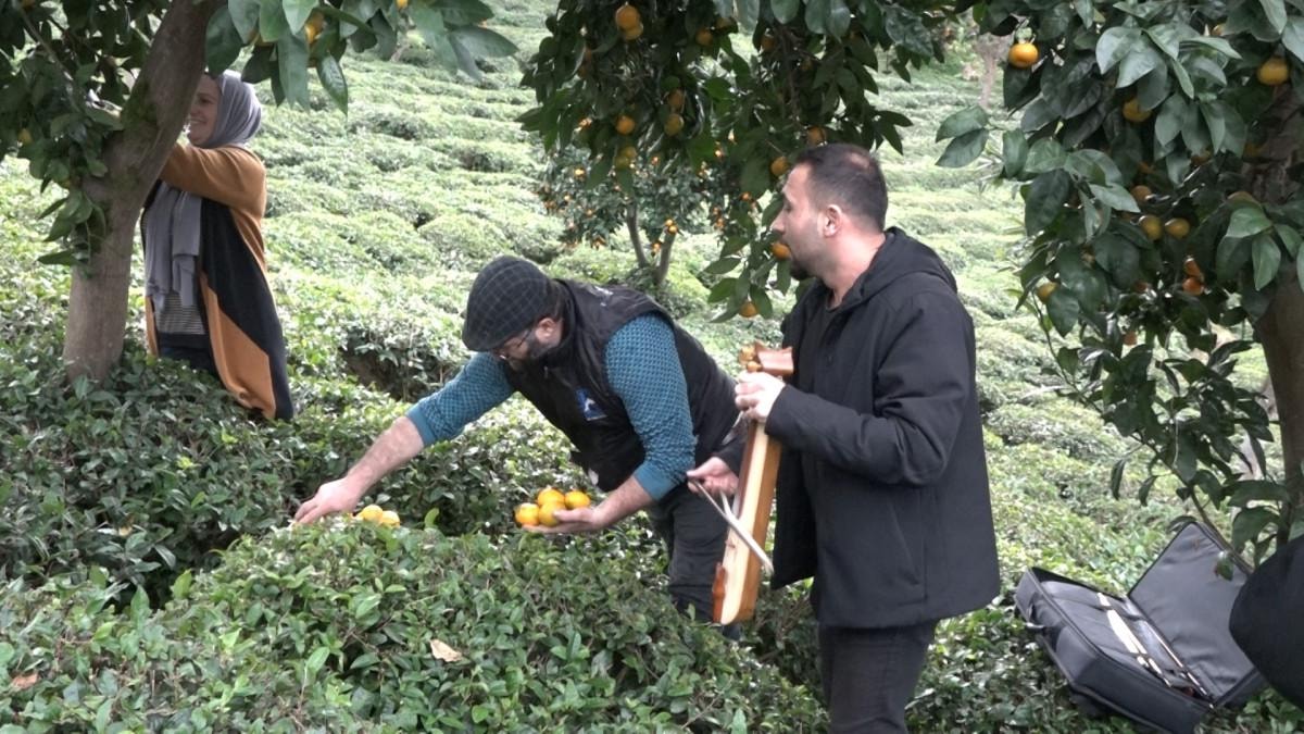 Kemençe ile çay bahçesine giren vatandaşlar mandalinalarını toplarken, kemençe müziği ile de eğlendi.