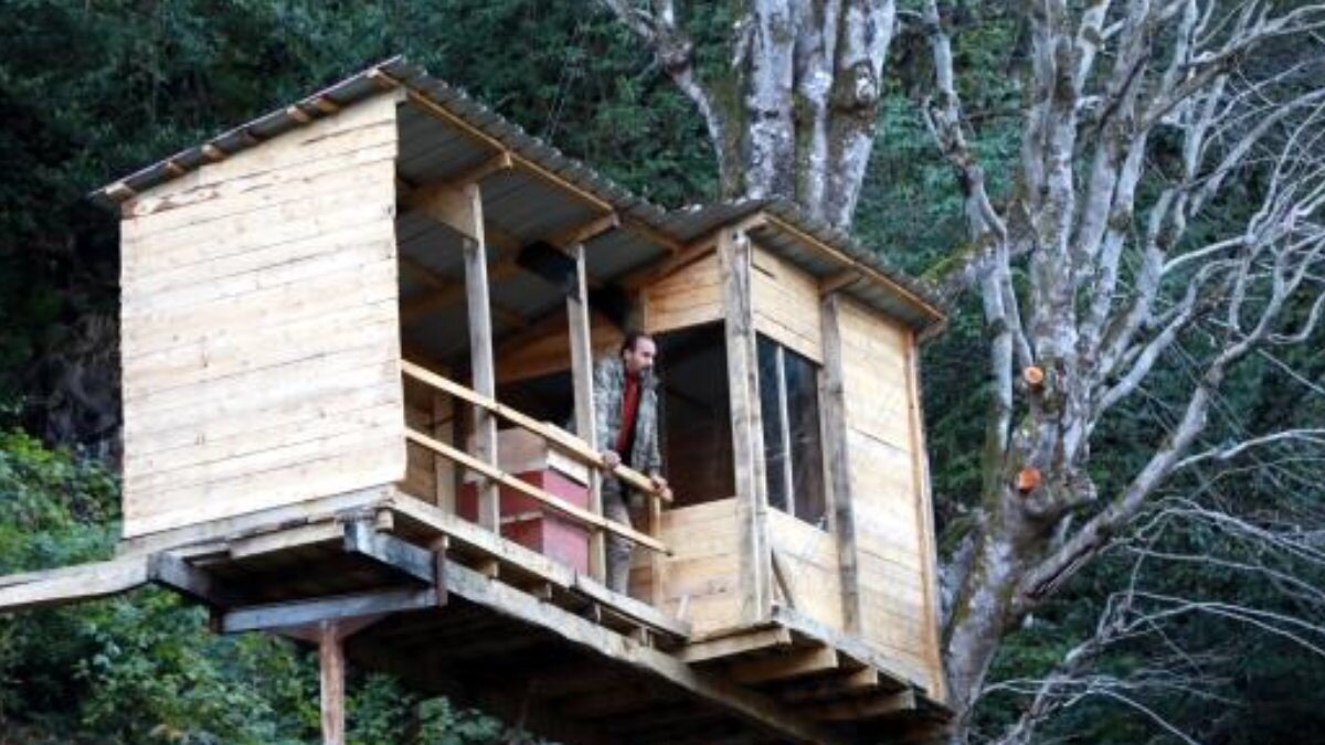 İlçede yaşayan 54 yaşındaki Erdoğan Baltacı, yerden yaklaşık 10 metre yükseklikte yamaca ve ağaç gövdesine çelik vidalalarla sabitlenmiş 10 metrekarelik ev yaptı.