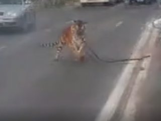 Amatör kameralarca kaydedilen görüntülerde, kaplanın eğitmeninin tasma ile bağladığı, eğitmeninin elinden kurtulunca yola atlayarak ters yöne doğru koştuğu ve eğitmenin de onu yakalamaya çalıştığı görüldü.