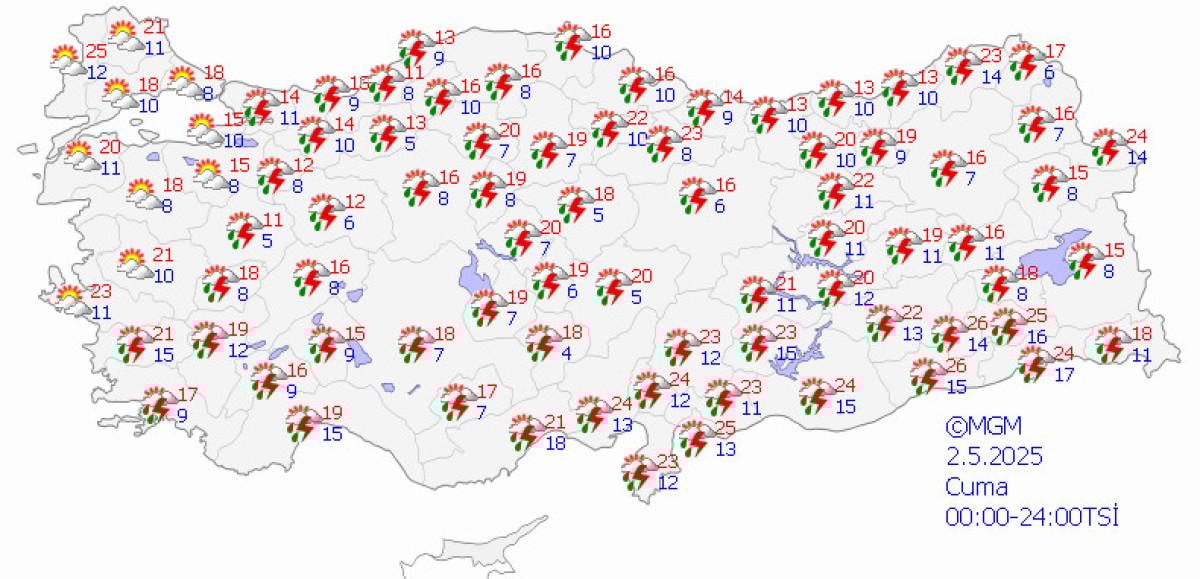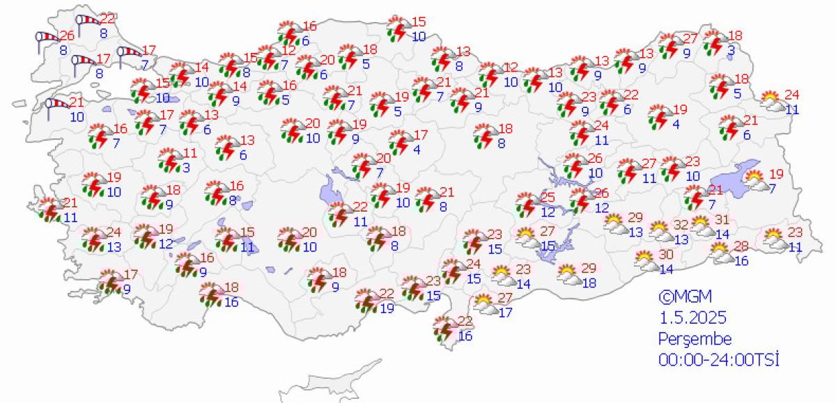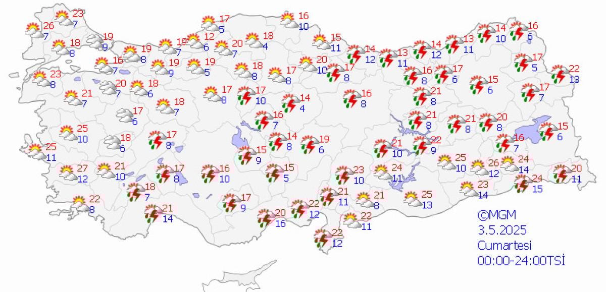 Meteoroloji Genel Müdürlüğü tarafından yapılan tahminlere göre; ülkemiz genelinin parçalı ve çok bulutlu, Marmara'nın güneydoğusu, Ege, Akdeniz, (Kırıkkale ve Çankırı dışında) İç Anadolu, Doğu Anadolu'nun doğusu, Güneydoğu Anadolu'nun batısı ile Gümüşhane çevrelerinin aralıklı sağanak ve gök gürültülü sağanak yağışlı geçeceği tahmin ediliyor.