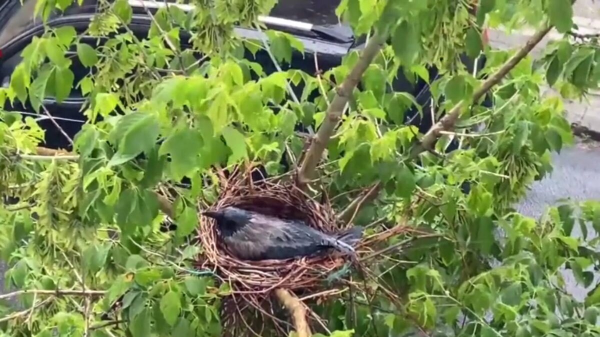Sağanak yağmurun başlamasıyla birlikte ağaçtaki yavrularını koruma altına alan karganın o anları görüntülendi.