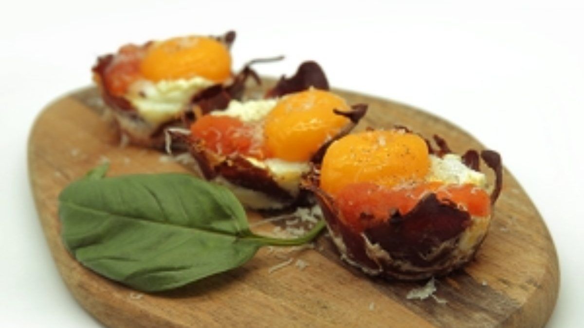 Sos tavasına zeytinyağını koyun ve doğranmış domatesleri ekleyip karıştırın. Ardından sarımsak, fesleğen ve tuzu ilave edip sos kıvamına gelinceye kadar pişirin. Muffin kabını yağlayıp pastırmaları tabak olacak şekilde yerleştirin ve 180°C deki fırında 4 dk kadar pişirin. Pastırma tabaklarına önce domates sosunda bir tatlı kaşığı koyun ve yumurta beyazlarını içerisine yerleştirin. Muffin kabını tekrar fırına alın ve yumurta beyazları 2/3 oranında pişirin.
