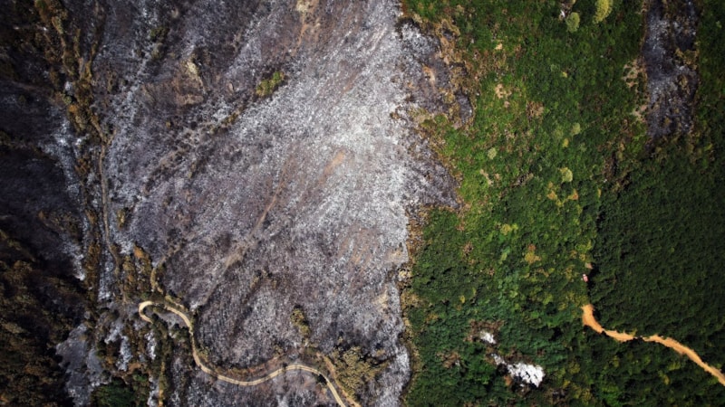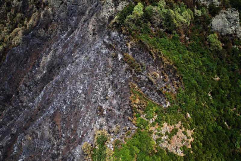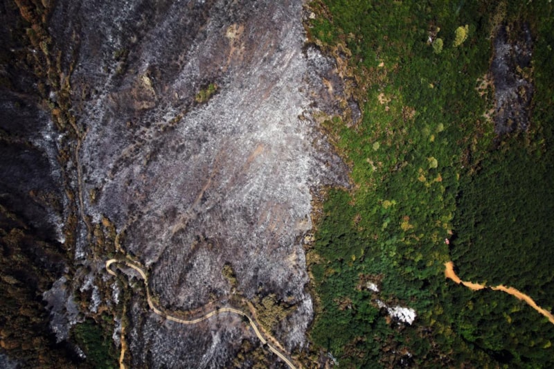 Bir tarafta yeşilin, diğer tarafta siyahın tonlarının olduğu alan havadan görüntülendi.