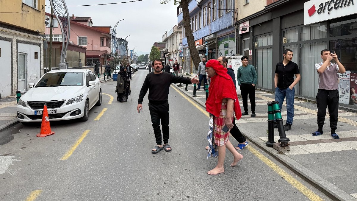 Deprem anına hamamda bulunan bir kişi peştemalle sokağa kaçtı.
