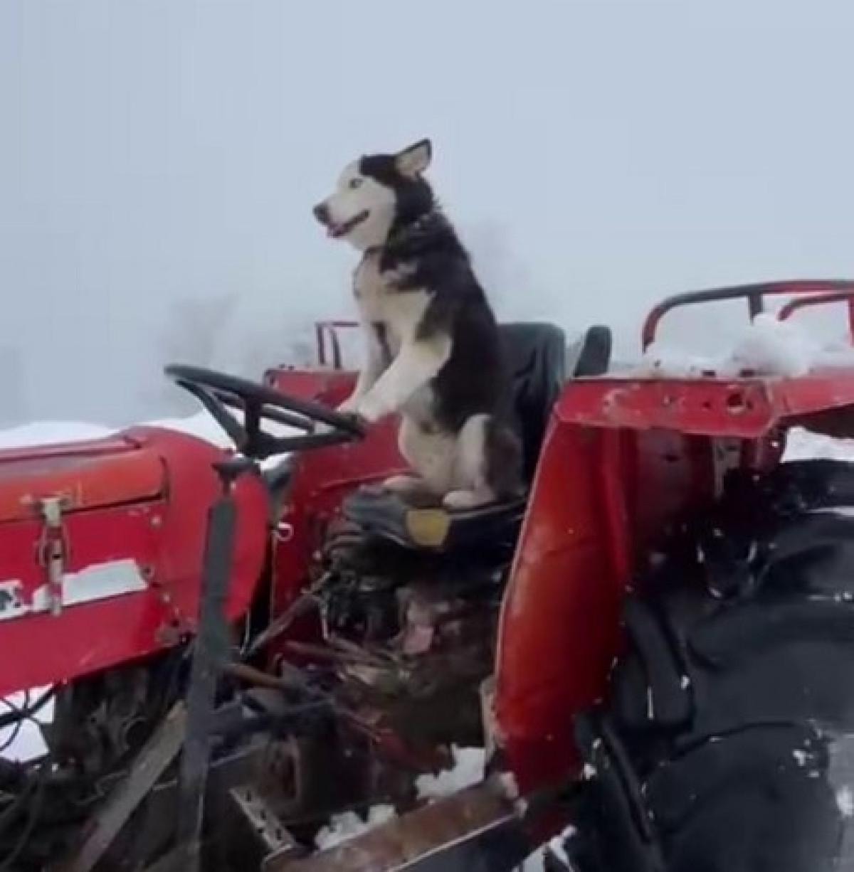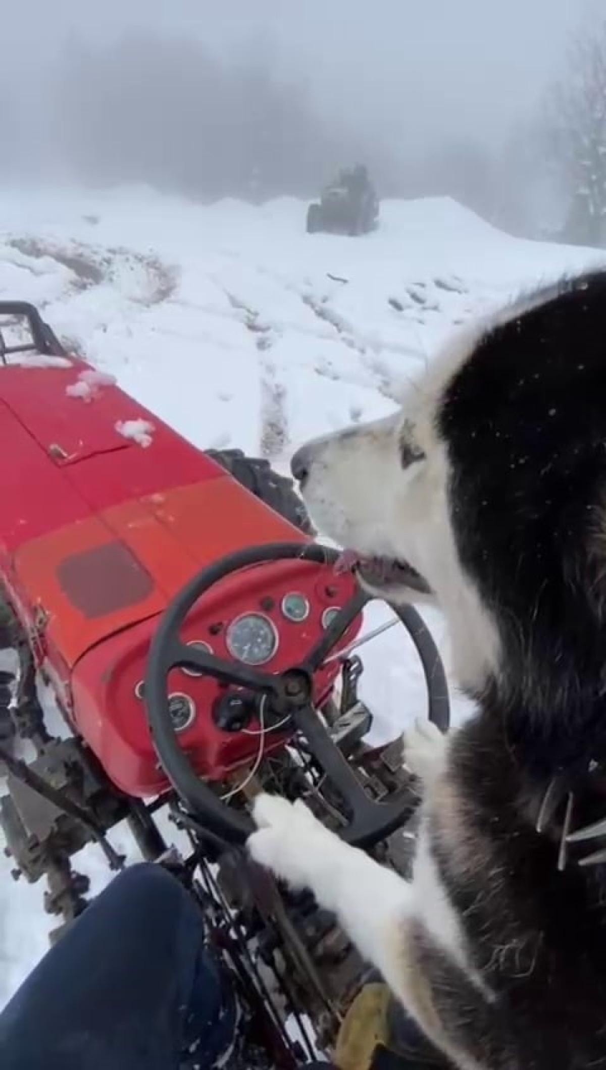 Karda metrelerce traktör kullandıran sahibi, o anları cep telefonuyla kaydederek, kar üzerindeki traktörün direksiyonunda köpeğin olduğu görüntüleri paylaştı.