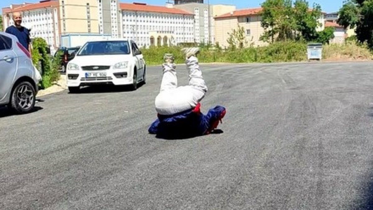 Sokağına asfalt gelmeyeceğini düşünen yaşlı adam, kendine ve arkadaşlarına asfalt gelmesi dahilinde üzerinde takla atma sözü verdi. Yol çalışmaları kapsamında yenilenen bozuk yol asfalt ile kaplandı.