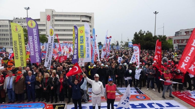 Meydanda toplanan sendika, sivil toplum kuruluşu ve siyasi parti temsilcileri, sunucu tarafından "Hoş geldiniz" anonsuyla karşılandı.