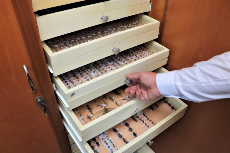 Biz öğrencilerimize böcekleri nasıl toplanıp muhafaza edeceklerini anlatıyoruz. Onlar da böceklerini böyle kutularda bizim koleksiyonumuza getiriyorlar. Bu böcekler bize geldikten sonra asistan arkadaşlarımız ile birlikte onları familya familya gruplandırarak buradaki dolaplara yerleştiriyoruz. Kendi özel böcek kutularımız vardır. Kendi çalışmalarımız ile elde ettiğimiz böcekleri bu özel kutularımızda saklayabiliyoruz. Böylece koleksiyonumuzu oluşturuyoruz.
