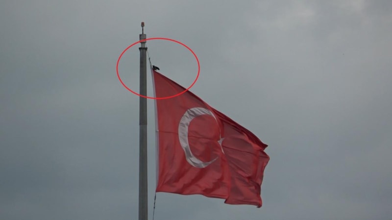 Zaman zaman havada dönerek yeniden yaklaşan karga, rüzgarın şiddetine rağmen birkaç kez bayrağın üzerine konmayı başardı.