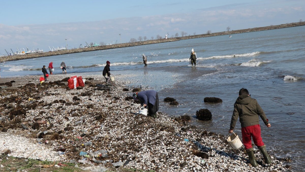 Kadınlar, eş ve çocuklarıyla beraber hem denizde hem de kıyıdaki salyangozları topladı. Çuval çuval salyangoz toplayan kadınlar, kilosunu 3-3,5 TL’den sattı.