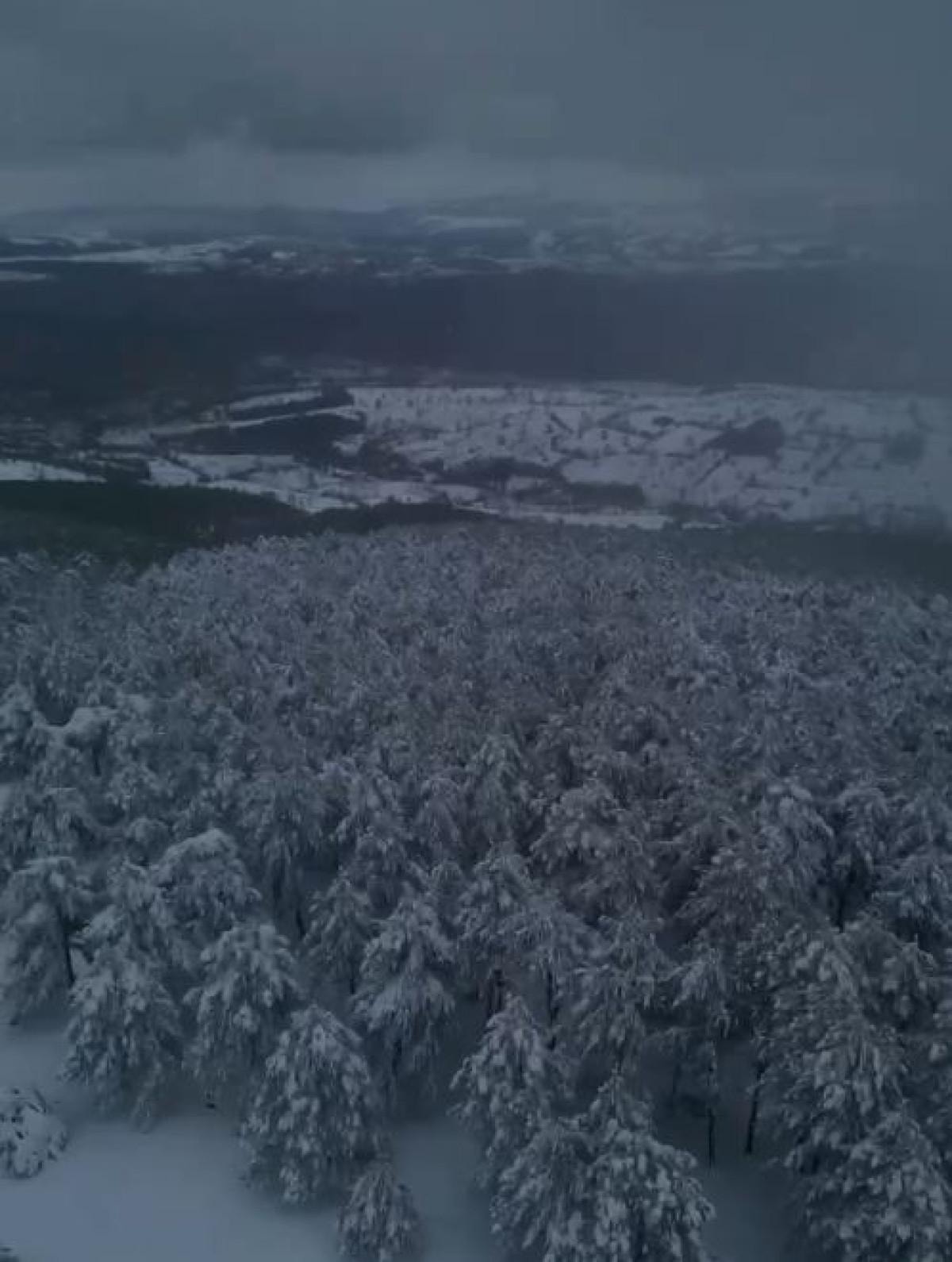 Belediyeye bağlı ekipler, kar nedeniyle kapanan yolları açtı. Kar yağışı aralıklarla devam ederken, bölge drone ile görüntülendi.