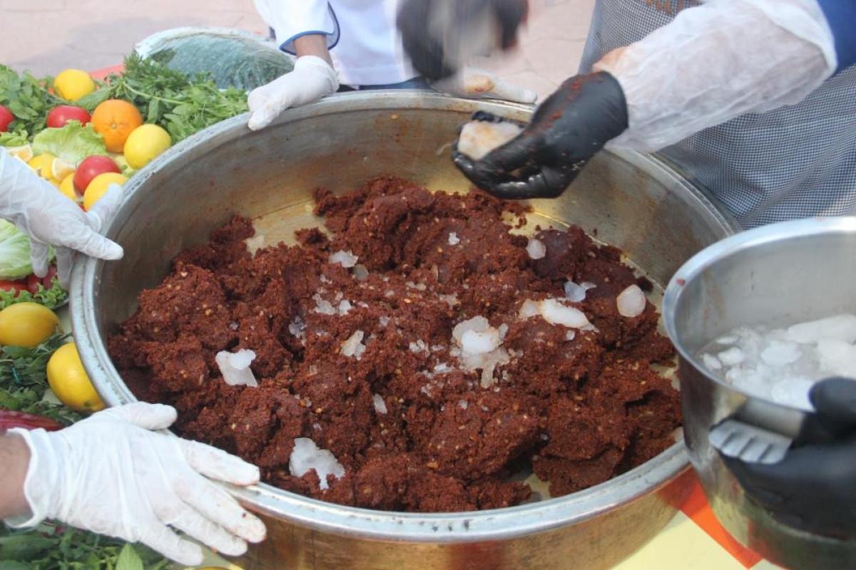 Halfeti Meslek Yüksekokulu ve Sosyal Bilimler Meslek Yüksekokulu Aşçılık Bölümlerinin öğrencileri, alana kurulan masaların üzerine lavaş ekmekleri dizdikten sonra şefler de yoğrulan çiğ köfteyi ekmeğe çekti.
