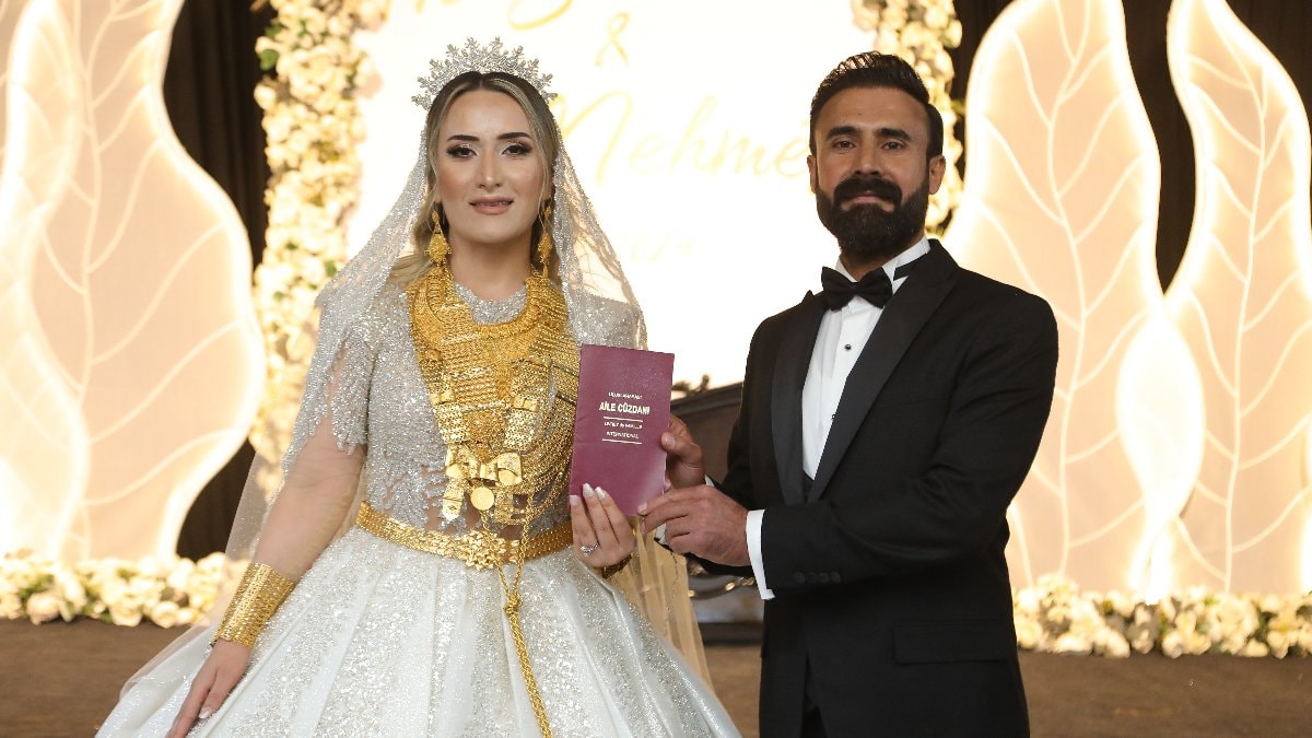 Altınların ağırlığı nedeniyle hareket edemeyen geline yakınları yardımcı olurken, altın takmayan davetliler ise salondaki sandığa para ve altın koyarak isimlerini yazdıkları zarfları attı.