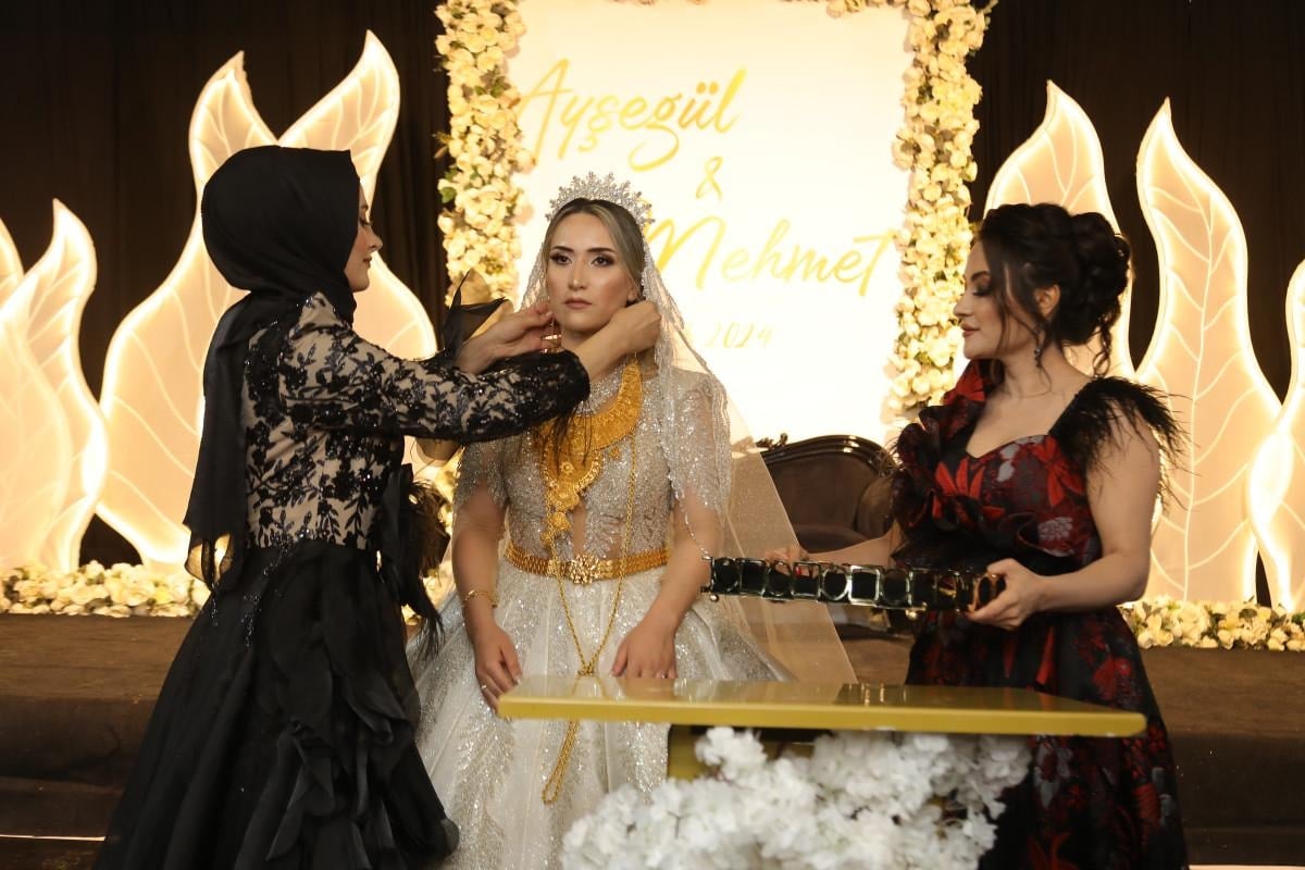 Yöresel yemek ikramı yapılan düğünde, özel kutu ve tepsilerde getirilen 6 kilo ağırlığında bilezik, taç, kemer, gerdanlık ve kolye gibi takılar geline takıldı.
