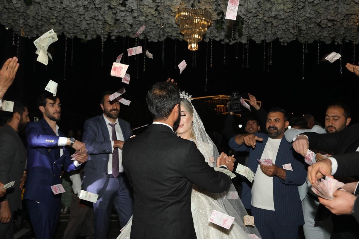 Deste deste dolarların ve Türk liralarının havada uçuştuğu düğünde, orkestranın görevlendirdiği 10 kişi ise yere atılan paraları toplayarak çantalara yerleştirildi.